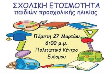 Η ημερίδα θα πραγματοποιηθεί την Πέμπτη 27 Μαρτίου στις 6 μ.μ. στο Πολιτιστικό Κέντρο Ευόσμου (Μ. Αλεξάνδρου 57) και κατά τη διάρκειά της θα συζητηθούν μια σειρά από καίρια ζητήματα όπως ενδεχόμενες δυσκολίες που αντιμετωπίζουν τα παιδιά προσχολικής ηλικίας κατά την περίοδο προσαρμογής τους στο σχολικό περιβάλλον, στάδια ανάπτυξης λόγου και ομιλίας, ψυχοκοινωνική ανάπτυξη του παιδιού, συναισθηματική ωρίμανση, σχολική ανάπτυξη και εξέλιξη, κ.α.
