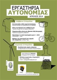 Σάββατο 5 Απριλίου 2014 11.00 – 12.30 Κατασκευάζω κάδο κομποστοποίησης Κομποστοποίηση με Γαιοσκώληκες & Κομποστοποίηση με Bokashi 13.00 – 14.30 Κάνω συντήρηση στο ποδήλατό μου Τεχνικός έλεγχος και συντήρηση ποδηλάτου 15.00 – 16.30 Παρασκευάζω μόνος μου βασικά είδη διατροφής Παρασκευή Ψωμιού & Γιαουρτιού 17.00 – 18.30 Φρεσκάρω το παλιού μου αγαπημένο t – shirt Μεταποίηση t – shirt 19.00 – 20.30 Βρίσκω την εσωτερική μου ηρεμία και ισορροπία Συνεδρία Yoga